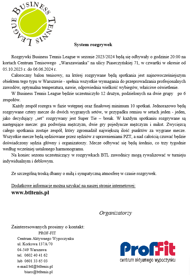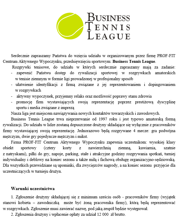 Oferta BUSINESS TENNIS LEAGUE sezon 2023/2024